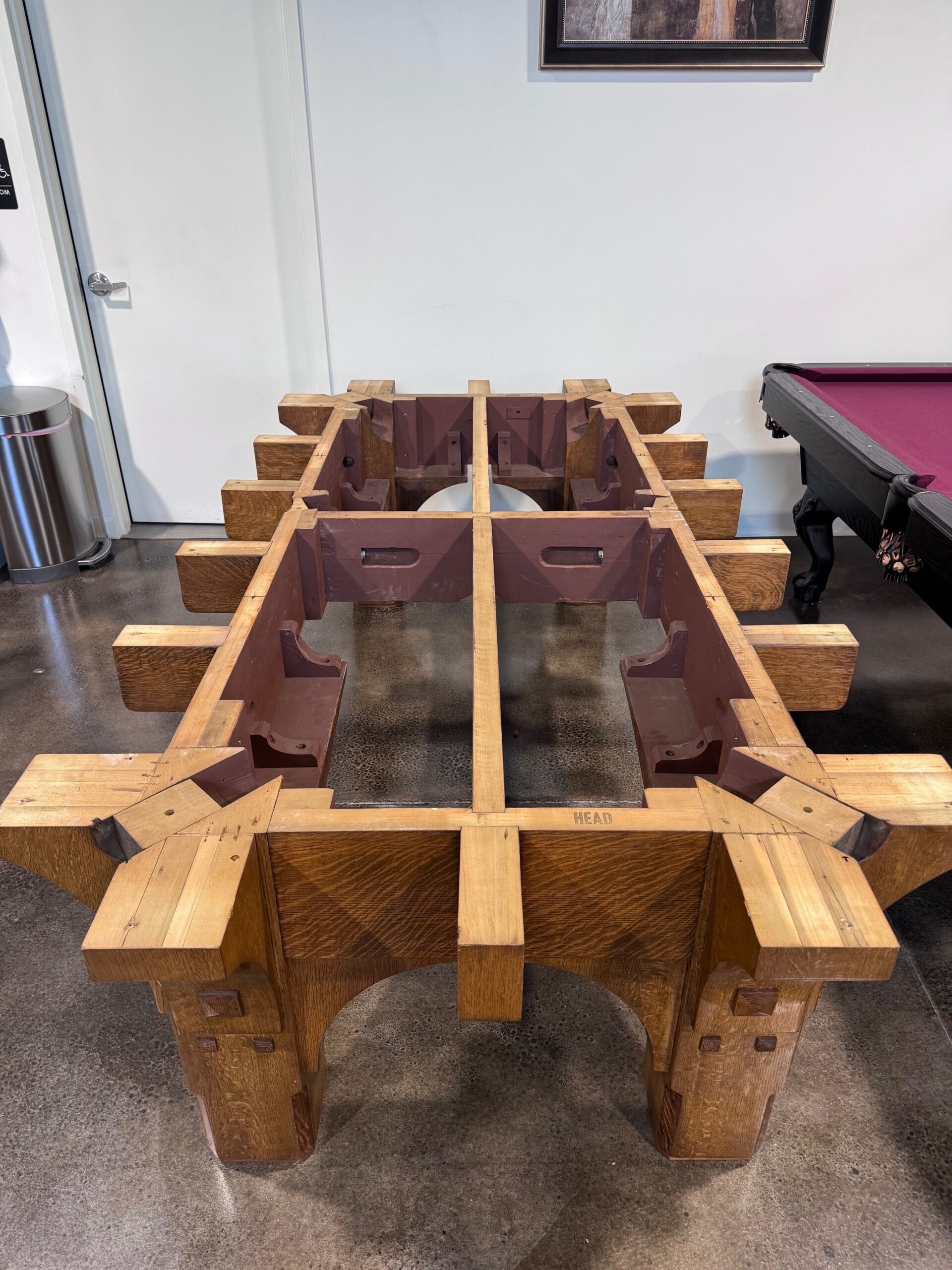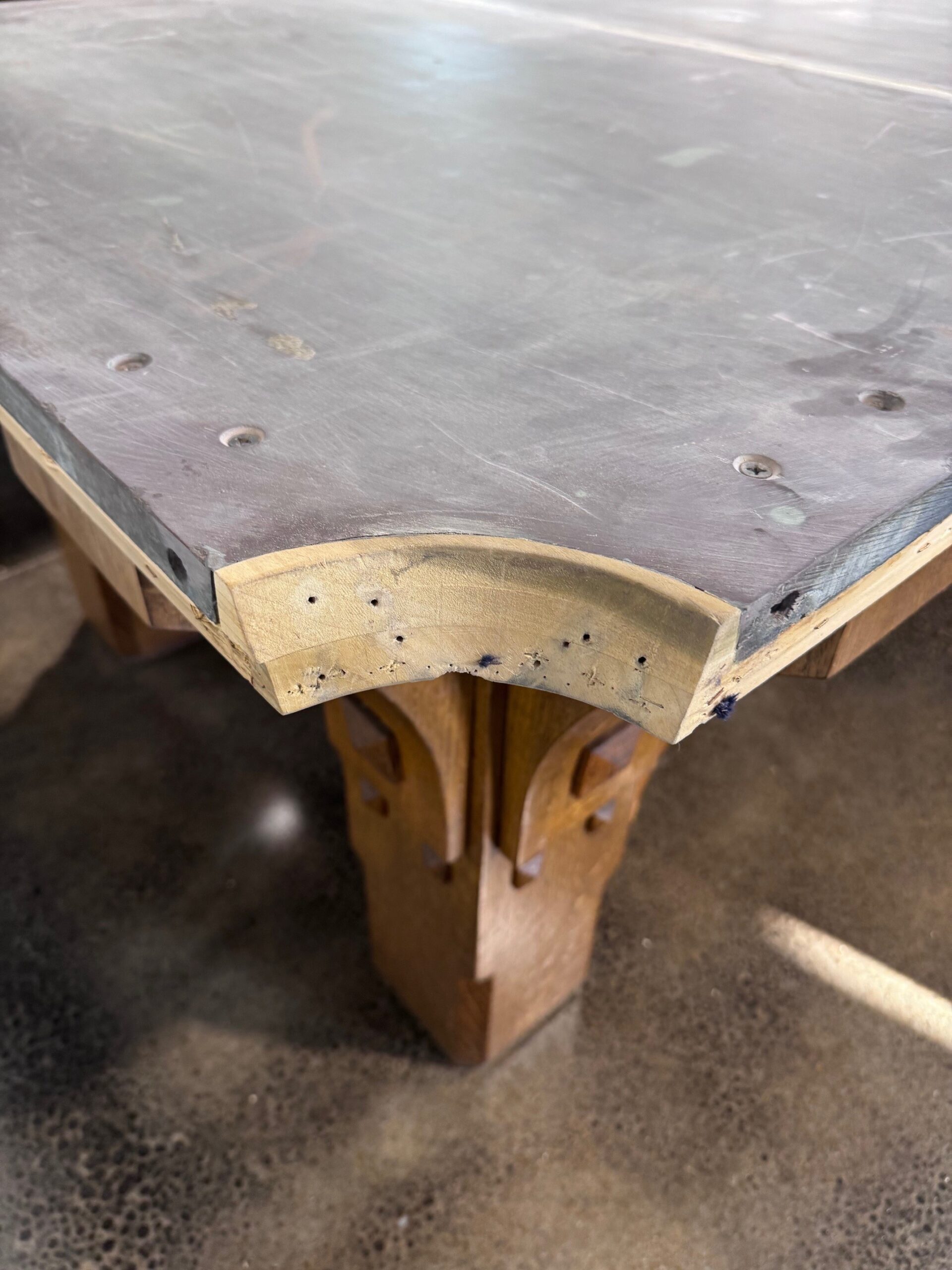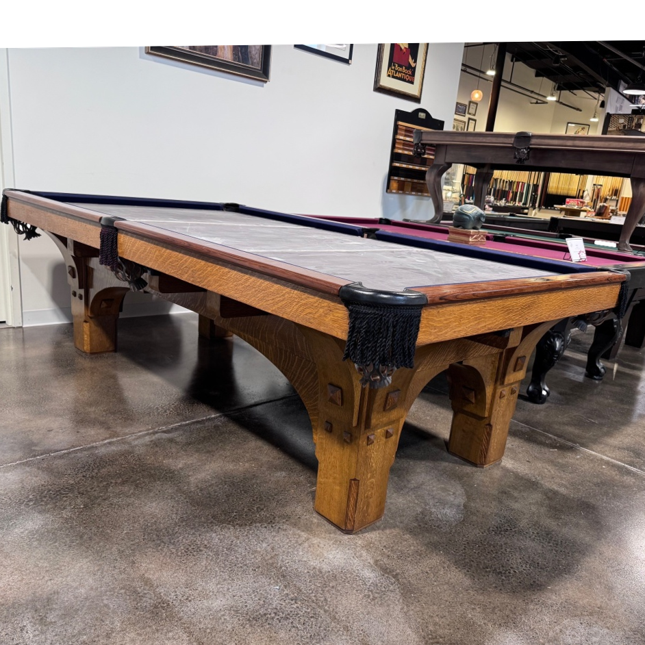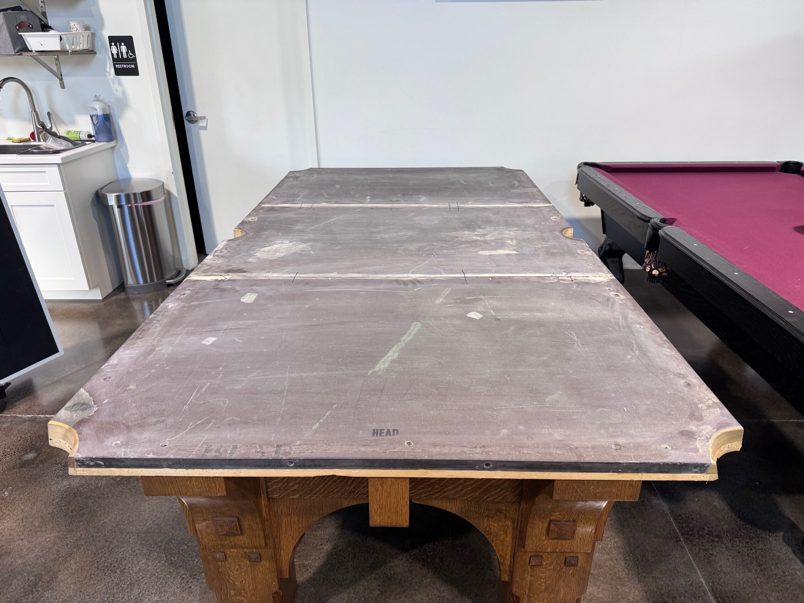 “Original Brunswick Catalogue Description:  The St. Bernard Mission style of construction and finish is by reason of its simplicity, plainness and substantial appearance, well adapted to billiard room uses, especially for hotels, clubs and private residences. The table is thoroughly well built from solid oak and finished in the conventional Old Mission color without polish or luster.